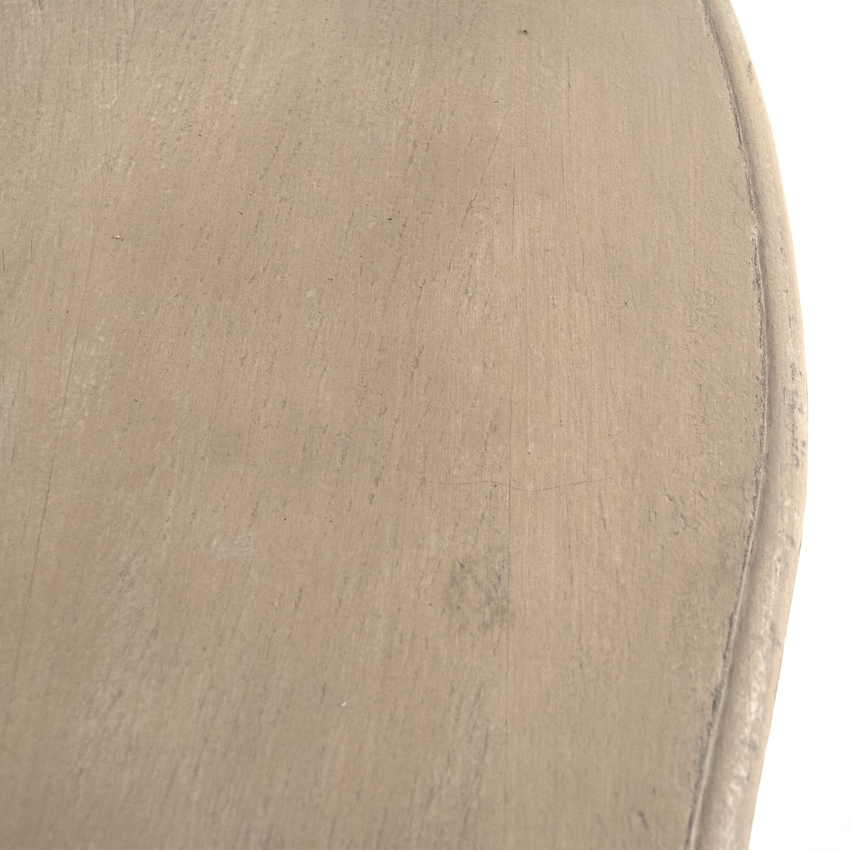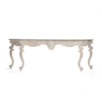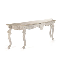 Intricately designed console with curved legs finished in off-white base with dry natural finished top.