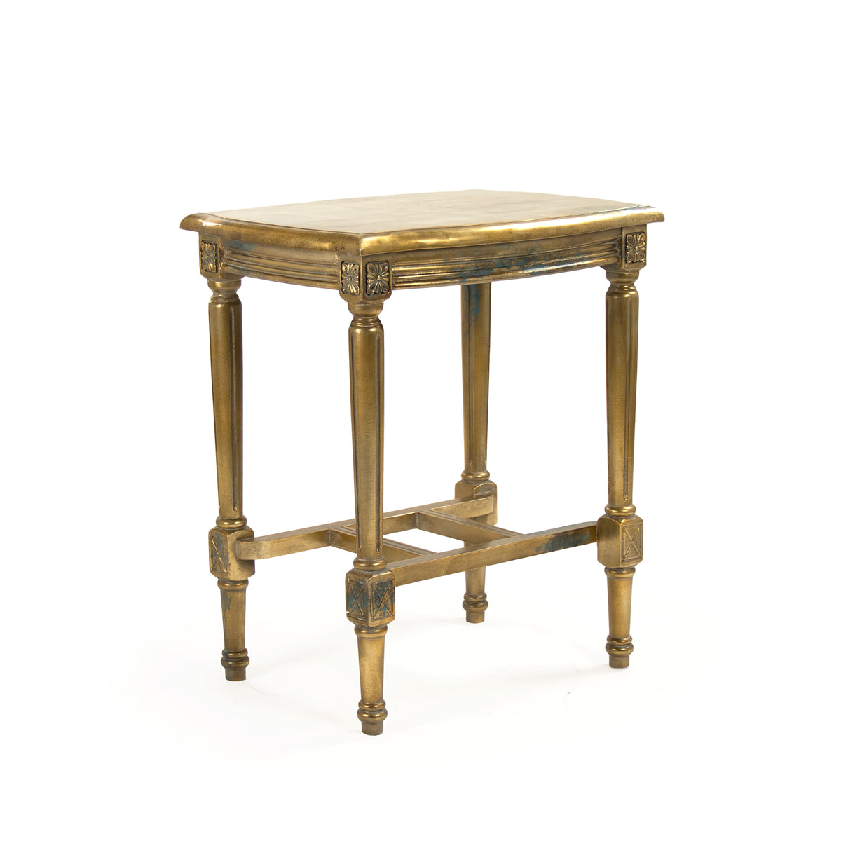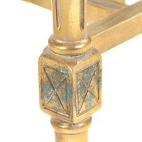 Metal end table with french accents in distressed gold finish.