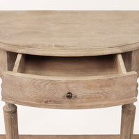 Demilune wall console with drawer and shelf in limed grey oak finish.