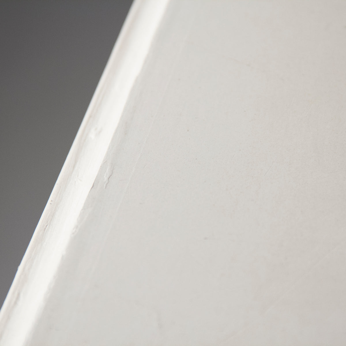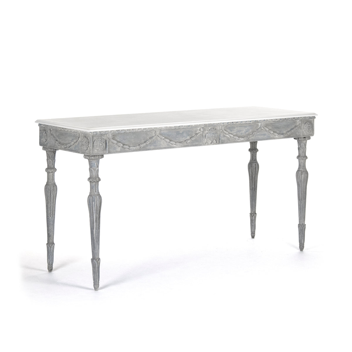 Intricately designed console with pillar legs finished in distressed blue grey base with white top.