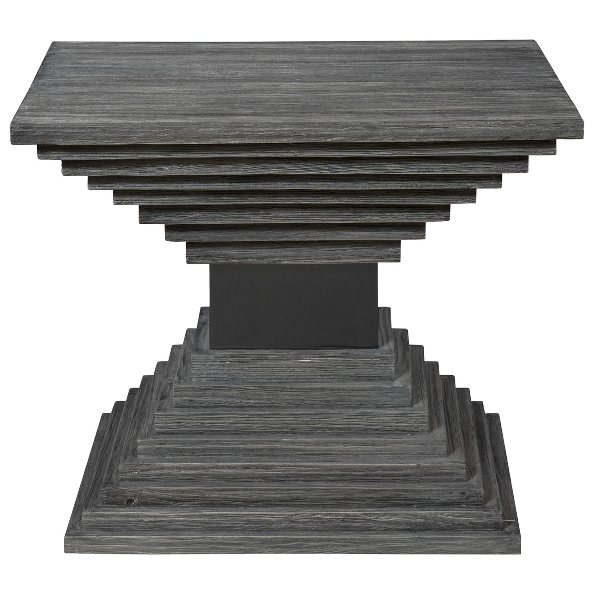 The Andes Accent Table Displays A Fun Geometric Construction From Solid Fir Wood. The Table Is Finished In A Medium Gray With Wire Brushed Details And A Light Gray Glaze, Accented By A Black Nickel Plated Stainless Steel Center Band. Group Multiples Together For A Contemporary Coffee Table.