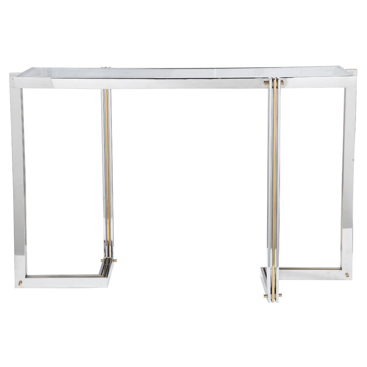 Modern Glam Console Features An Asymmetrical Dual-toned Stainless Steel Frame Finished In Polished Nickel And Polished Gold With A Clear Tempered Glass Top.