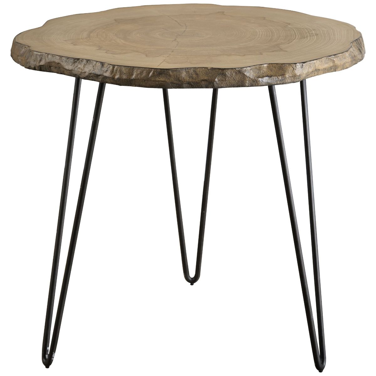 Influenced By Modern Lodge Style, This Side Table Features A Cross Cut Veneered Wood Slab Top With Live Edge Details Paired With A Simple Iron Hairpin Base Finished In Aged Black.