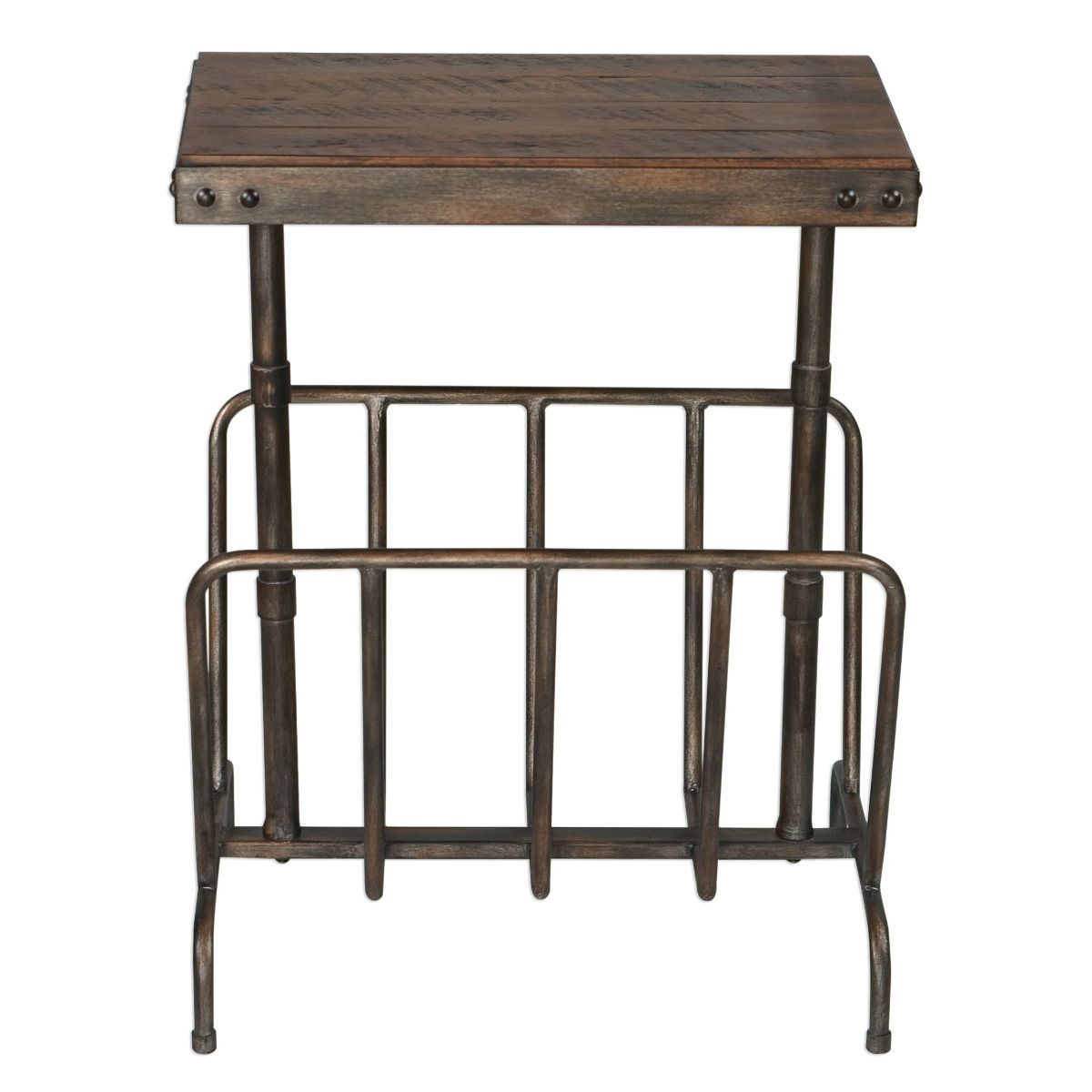 This Functional Accent Table Features A Convenient Magazine Rack With An Industrial Iron Framework Finished In A Lightly Burnished Brushed Iron With Rivet Accented Corners. Top Is Solid Acacia Wood Finished In A Distressed Warm Walnut Stain.