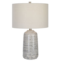 This Ceramic Table Lamp Has A Unique Shape Featuring A Traditional Style Urn Body That Has Cut Edges At The Bottom For A Subtle Contemporary Flair, Finished In An Ivory Glaze With A Heavy Striped Gray Drip And Brushed Nickel Plated Accents. The Lamp Is Complemented By A Hardback Drum Shade In A Light Beige Linen Fabric With Natural Slubbing.