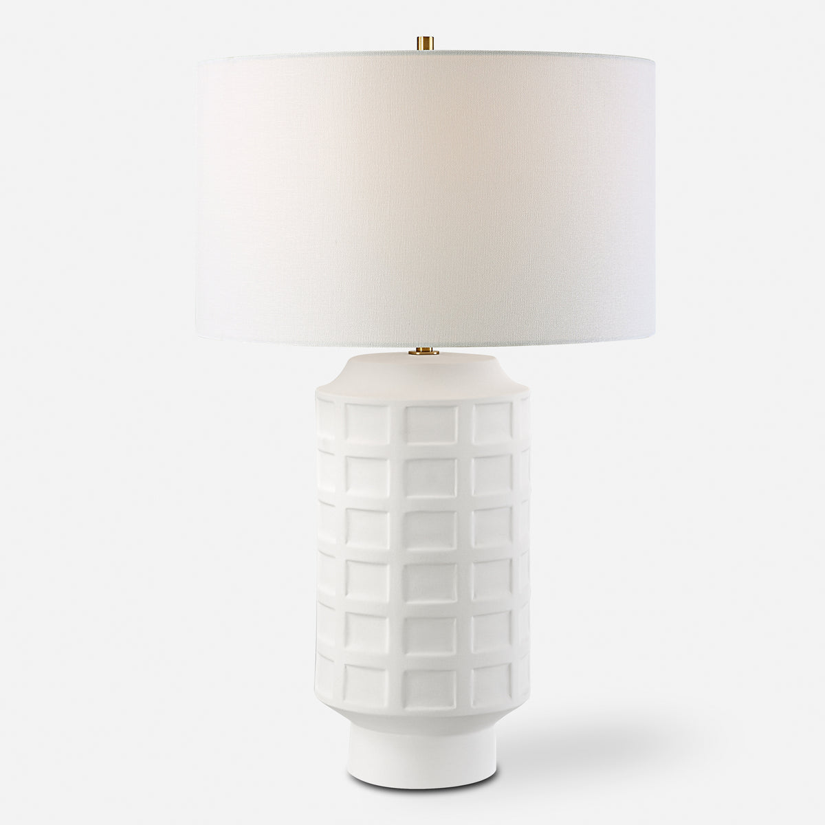 This Contemporary Ceramic Table Lamp Features A Repeating Window Pane Pattern Of Embossed Tiles Finished In A Chalk White Glaze Accented With Antique Brass Plated Details. The Round Hardback Drum Shade Is A Casual White Linen Fabric.